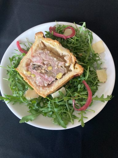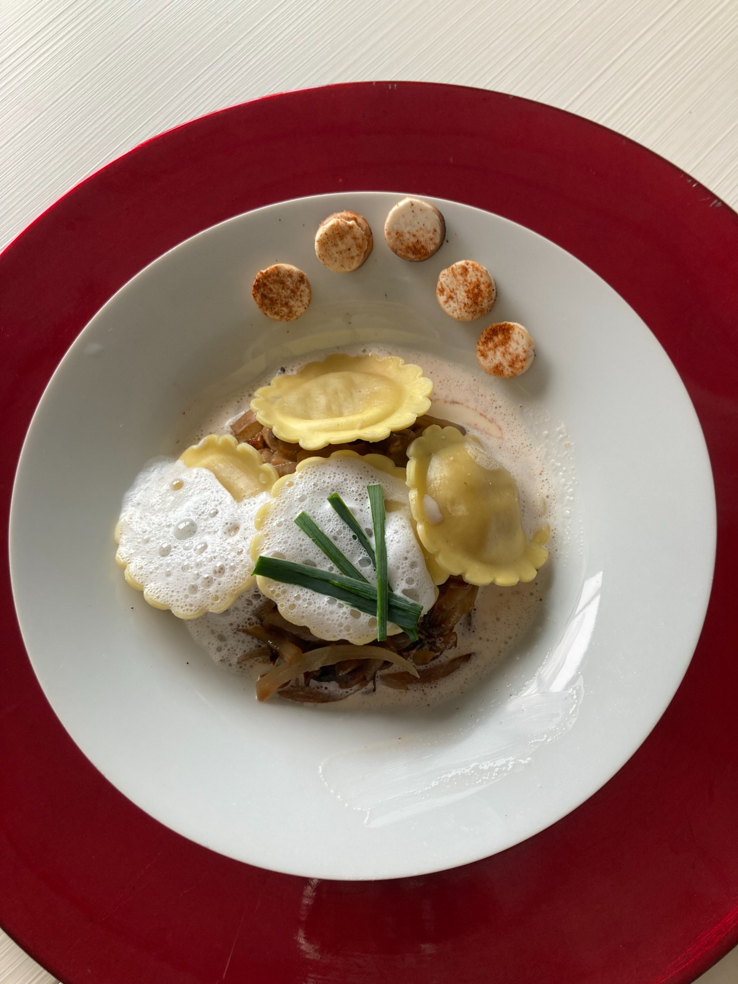 Pâte à ravioles fraiche, Cèpes en julienne, compotée oignons Cèpes, émulsion de lait et crème, paprika doux.