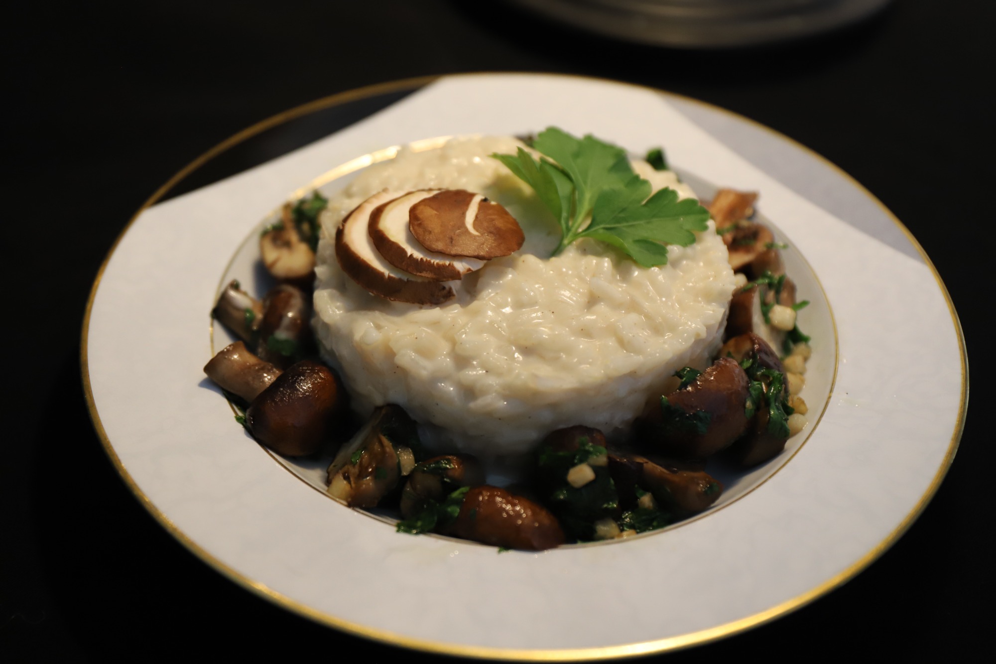 Les échalotes, le riz rissolent et sont déglacés au vin blanc. Bouillon de volaille, parmesan, crème et Champignon cuit ail, persil.