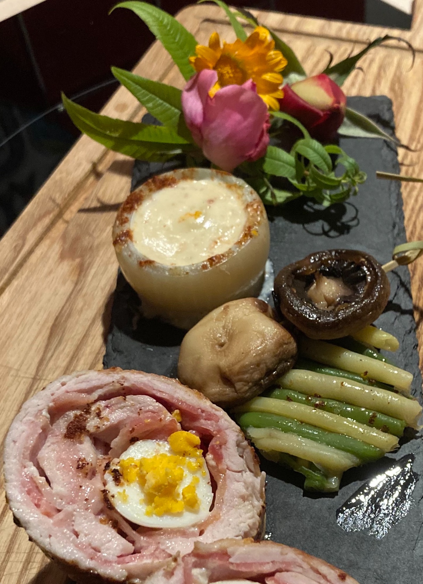Viande de Dinde, poitrine fumée, oeuf dur, mijoté en cocotte, sauce créme à l'ail, champignons, haricots verts jaunes frais