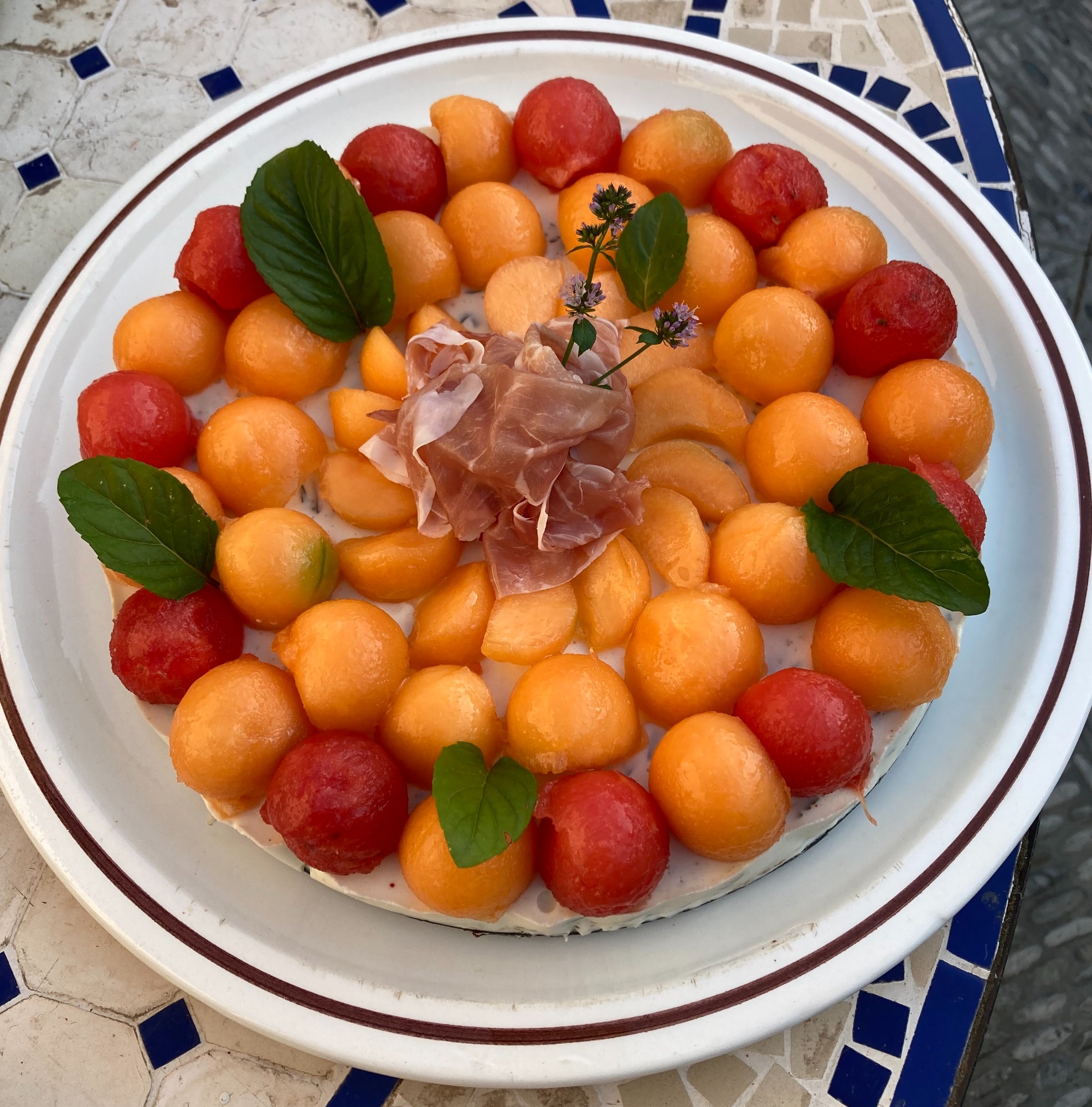 Fond de tarte crackers maison, fromage frais ciboulette, billes de melon et de pastèque, jambon sec, Basilic