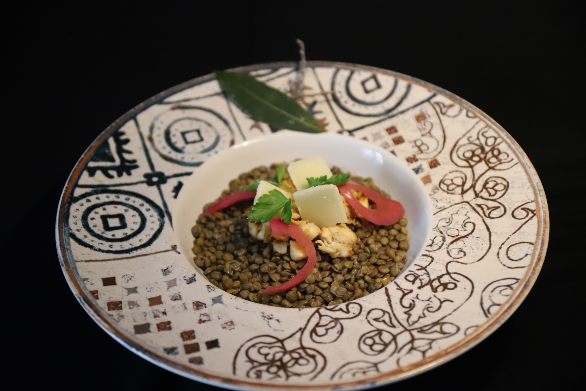 Lentilles vertes du Puy, thym, Laurier, émincé de filet de poulet grillé, pickles d'oignons rouges et copeaux de Parmesan.