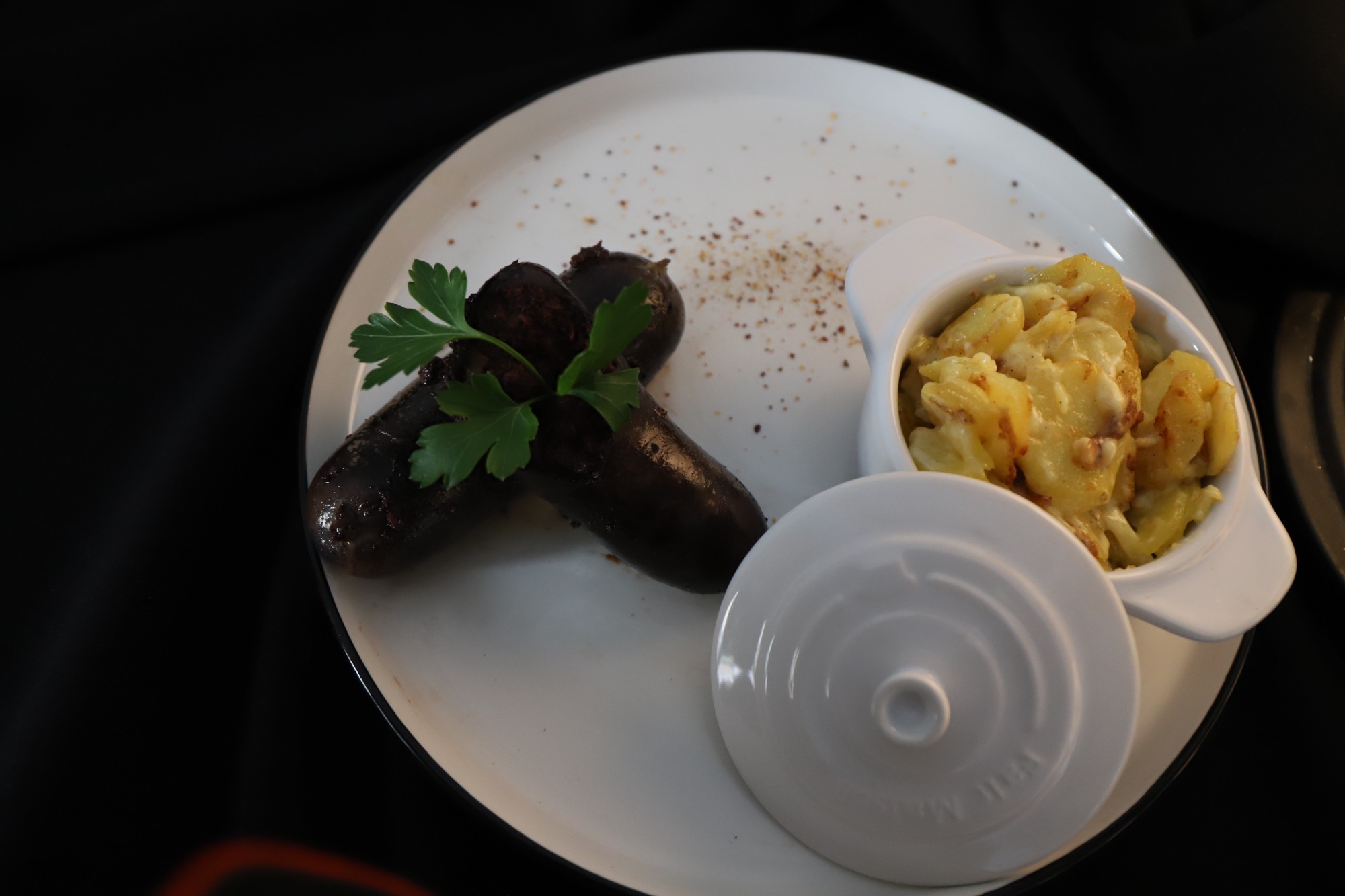 Boudin aux oignons grillés avec un gratin Dauphinois, Pommes de Terre tranchés, plat frotté à l'ail, crème.