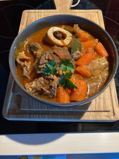 Morceaux de boeuf choisis avec os à moelle carottes, navets ronds, poireaux, céleri branche, pomme de terre en fin de cuisson.