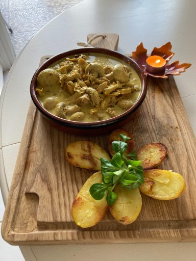 Émincé de poulet rôti, champignons frais , moutarde ancienne, curry, lait de coco, pomme de terre Grenaille grillée.