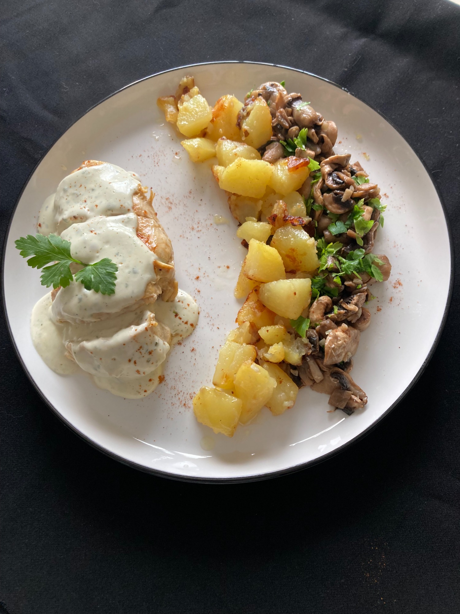 Filet de poulet fermier grillé avec une sauce boursin et crème, accompagné de pommes de terre sautées et d'une fricassée de champignons ail